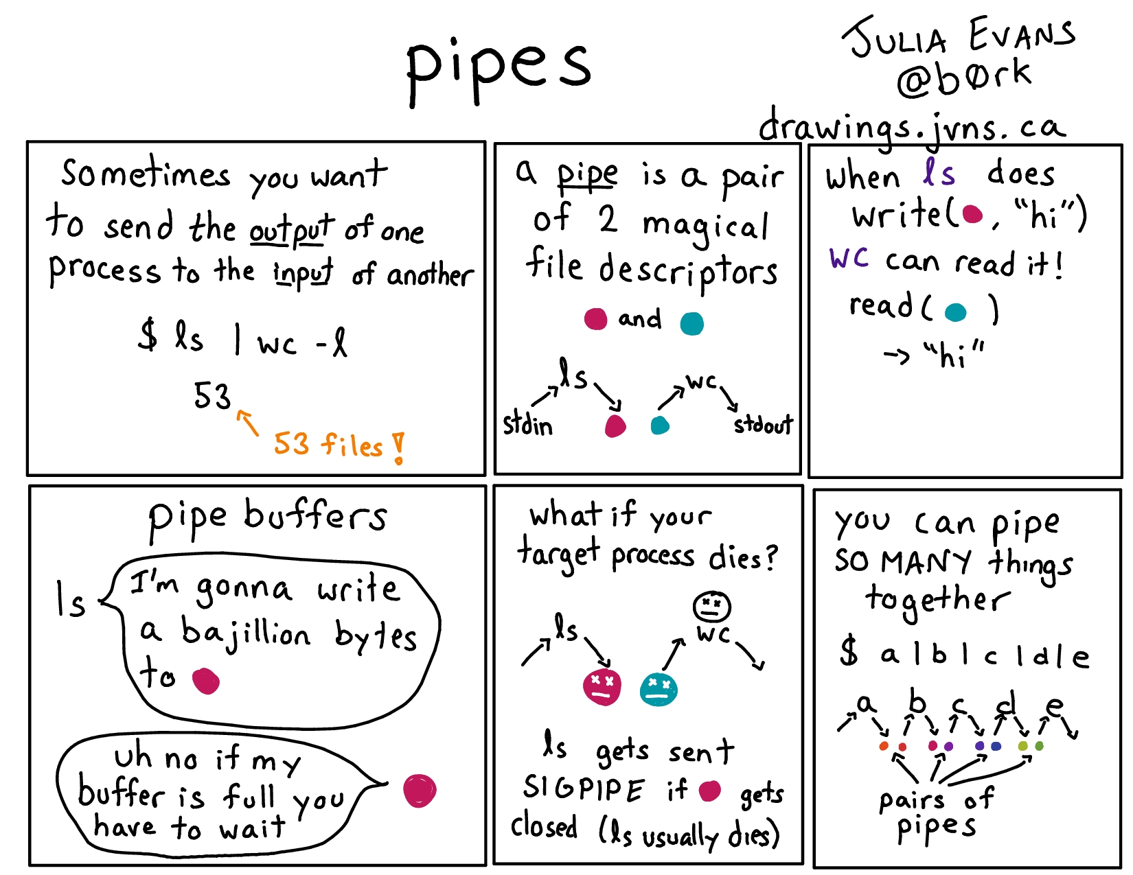 Pipe, |, bridges two processes together. It represents the system call to pipe() and all it does is redirect stdin and stdout for processes.